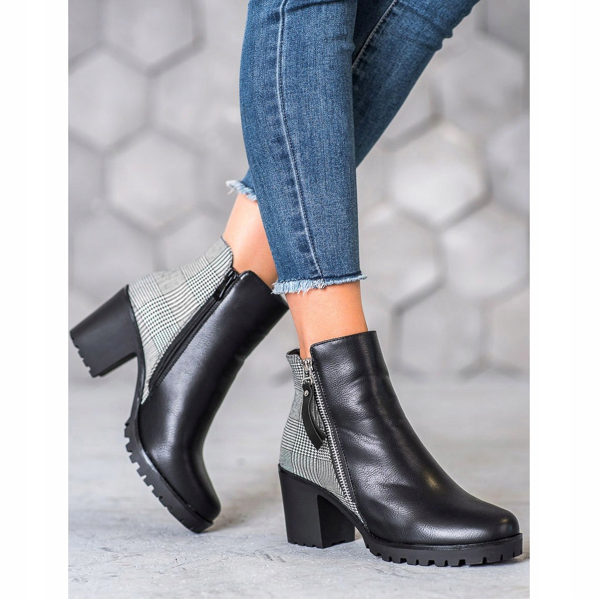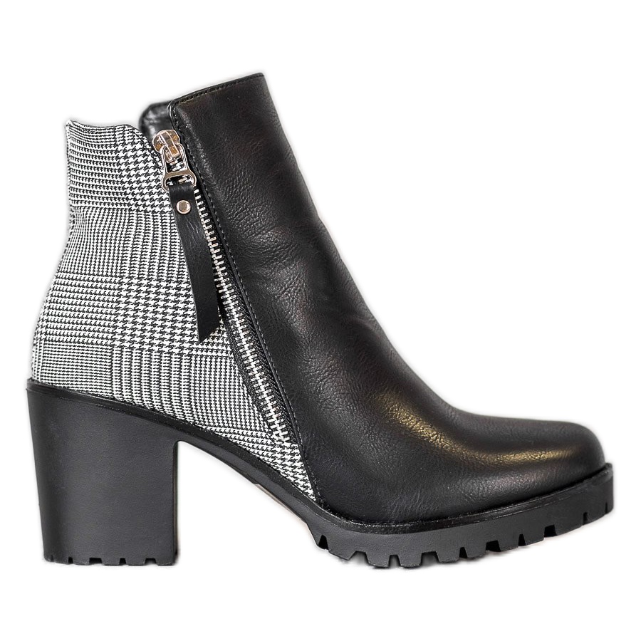 Discover elegance and comfort with Filippo ankle boots! These black women's ankle boots with uppers reaching above the ankle are the perfect choice for colder days. The front of the shoes looks classic in deep black, while the back is decorated with a fashionable black and white check pattern, which gives them a unique character.