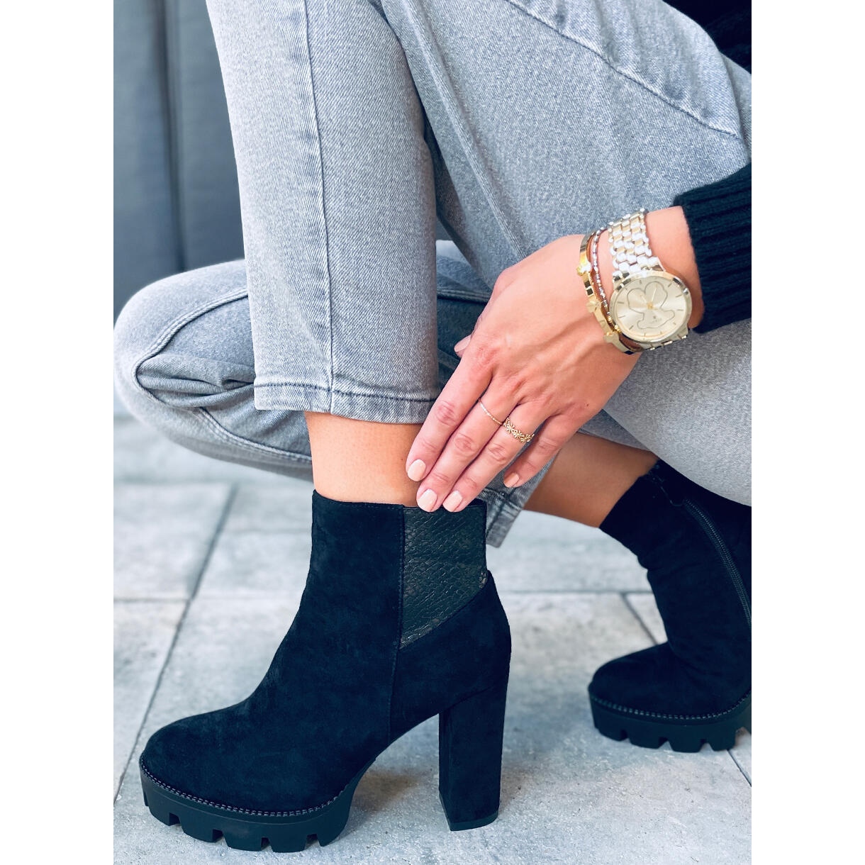 Discover the unique Ase Black block heel and platform ankle boots that will add elegance and a touch of avant-garde to your styling. Made of ecological suede, these black ankle boots stand out with their simple yet effective design, which, combined with the snakeskin motif, gives them a unique character.