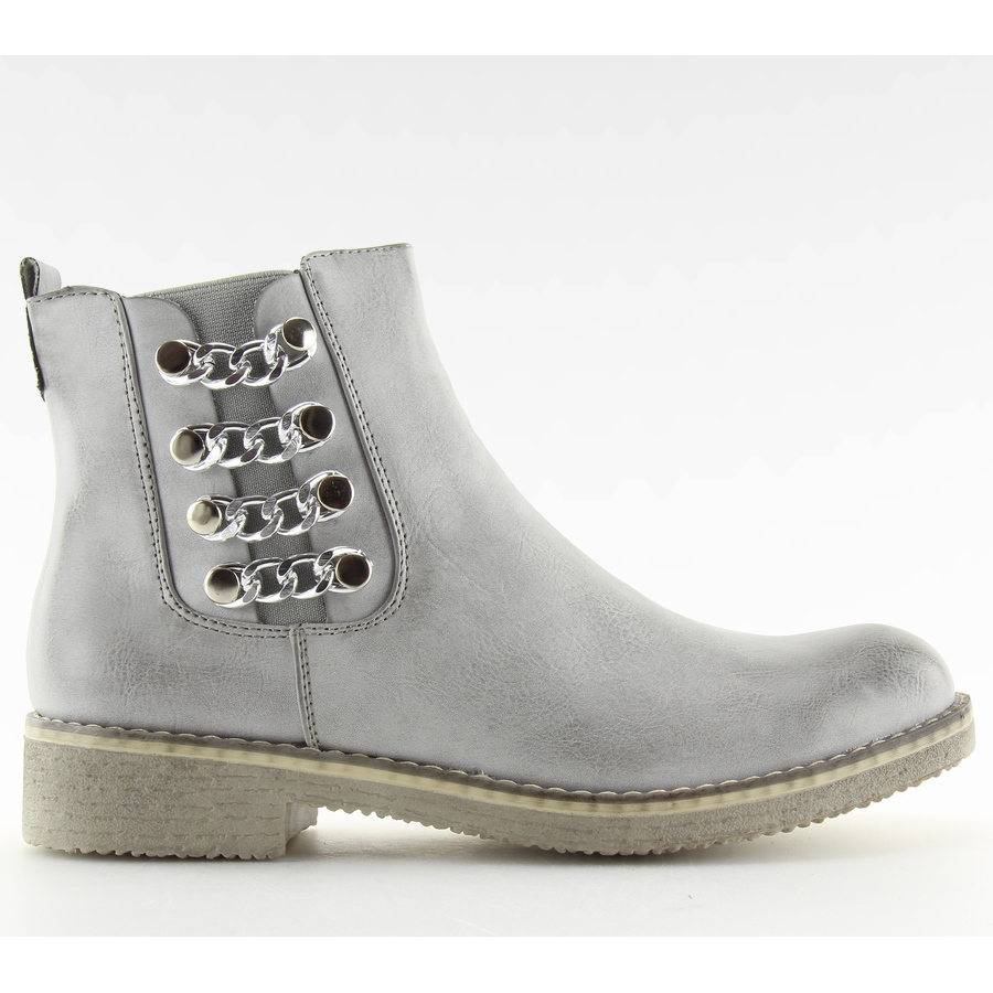 Stylish, gray F2333 Chelsea boots are a combination of rock character and everyday comfort. A neat, ankle-length cut decorated with eye-catching chain elements and rhinestones gives the shoes a modern, bold look that will perfectly complement both casual and more aggressive styles. Made of ecological leather, with a practical zipper at the back for easy putting on.