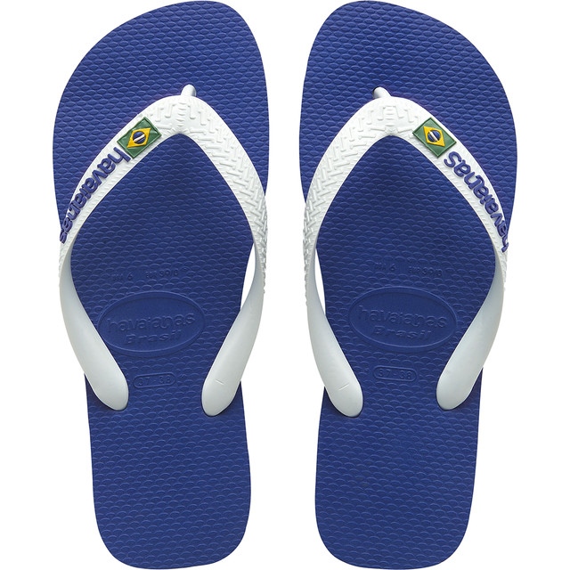 Classic Japanese Havaianas Brasil Logo in Marine Blue - a combination of convenience, durability and Brazilian slack. Made of a patented, soft rubber compound with antibacterial properties, they ensure comfort all day. The characteristic texture of the insert inspired by rice grains gently massages the feet and supports comfort while walking, and a solid sole guarantees good cushioning and protection against hot and uneven ground.