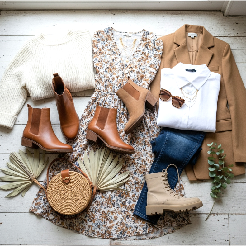 The key to this look lies in the proportions: the midi dress - ending around mid-calf - goes perfectly with the ankle boots, which are fully visible. Brown gives the whole look a warm, spring energy, while the floral print of the dress balances the raw leather of the shoes.