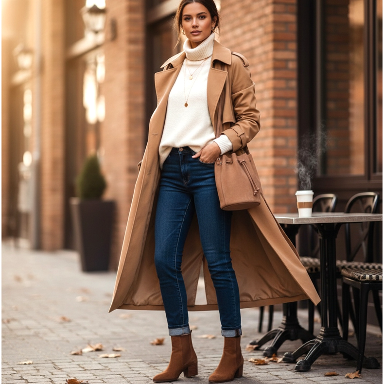 This outfit will be completed with a long camel-colored trench coat, a nude suede bucket bag and discreet gold jewelry. It's a look you can wear both for your morning coffee and for a casual business meeting at the office. It is comfortable, stylish and always up to date.