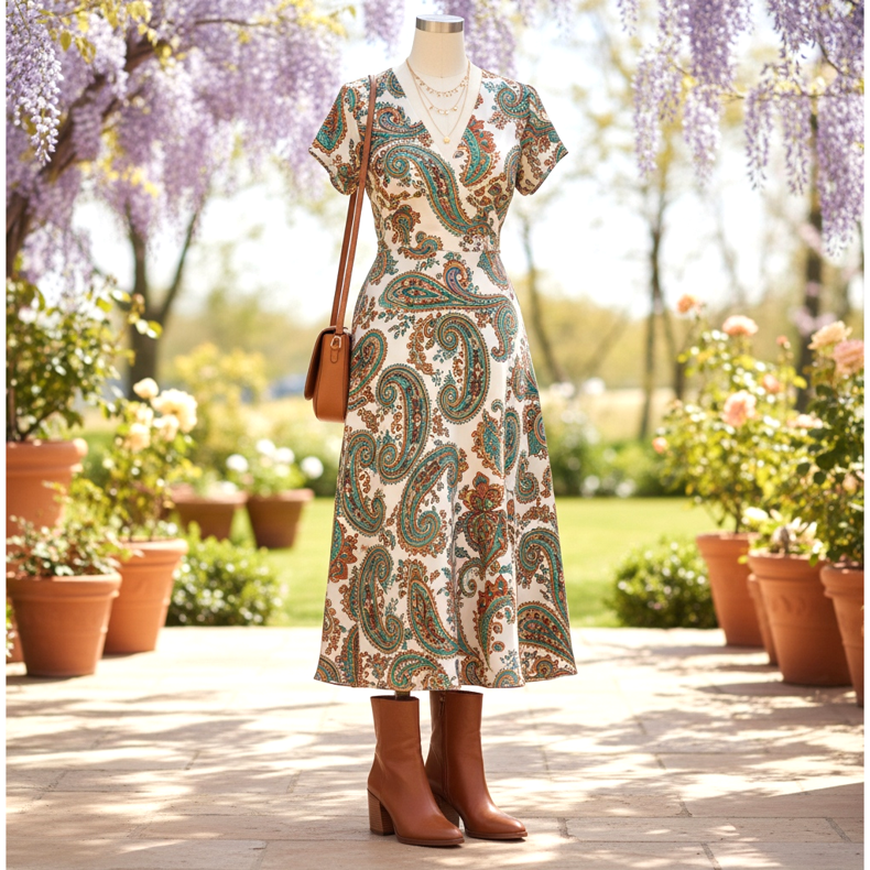 A midi dress made of viscose or silk in a paisley or floral print combined with brown high-heeled ankle boots is the perfect look for a spring wedding or a loved one's birthday. Add a tan leather shoulder bag and a delicate necklace - the effect is ready.