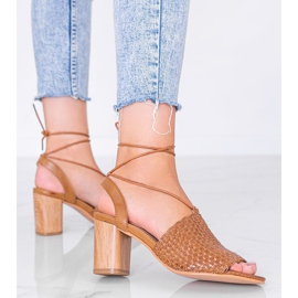 We present the brown braided Estrella block heel sandals, which impress with their elegant and modern design. These unique sandals, made of matte eco-leather, combine style and comfort. The braided pattern of the upper harmoniously matches the heel in a wood motif, which gives them a unique character.