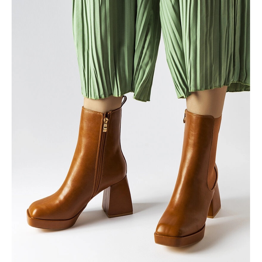 Brown boots on the massive Watson post - a caramel classic that will add character to any stylization. The ankle -reaching boots are distinguished by a strong, 9 cm post and a fashionable square nose. A smooth, ripped upper made of ecological leather in a shade "caramel" blends well with a light beige sole made of plastic, creating a coherent, elegant whole.
