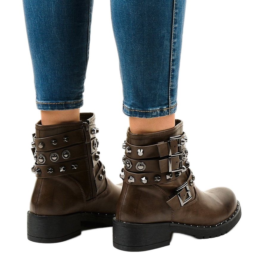 We present the 77-8 brown insulated ankle boots in green – the perfect choice for every fashionable woman who values the combination of comfort, style and practicality. These unique ankle boots, made of high-quality imitation leather, are distinguished by an elegant upper in brown tone, decorated with wide straps and decorative studs and buckles.