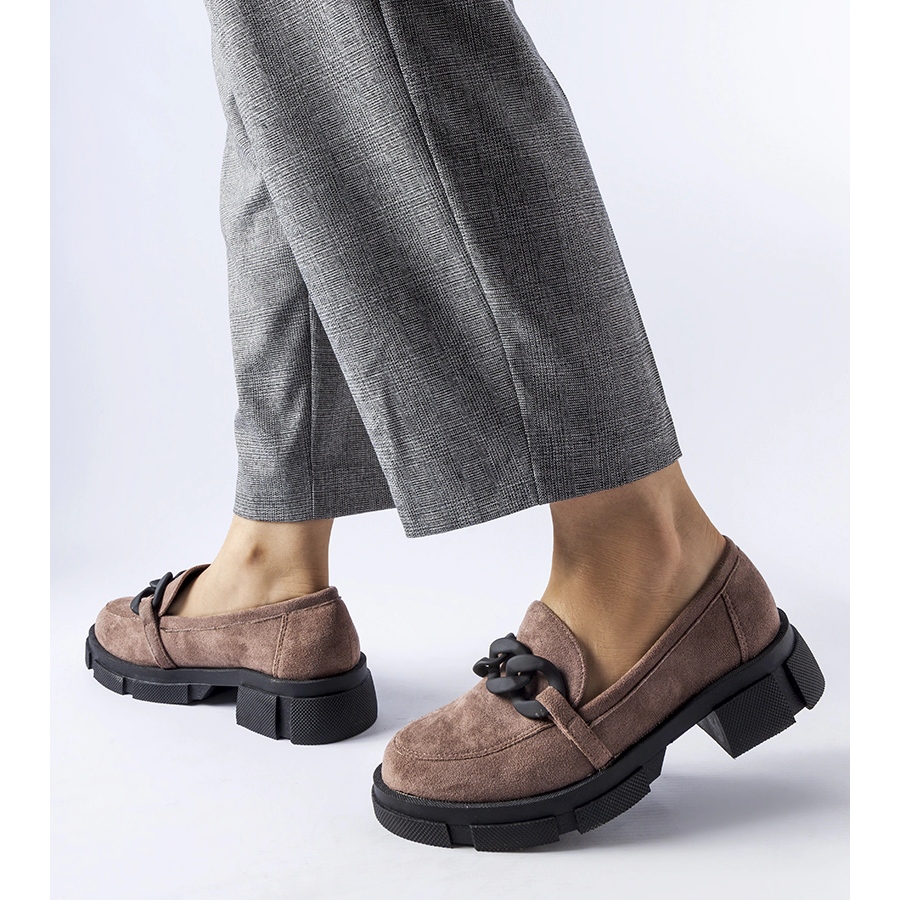 These khaki loafers with a black sole and no pattern are in line with the latest trends, while offering timeless elegance. Whether you're going for a walk around town or a meeting with friends, these women's shoes will be the perfect complement to any summer style. Comfortable, stylish and functional - brown loafers with an eco-suede chain are a must-have in every woman's summer collection!