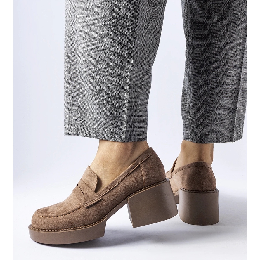 Elegant and comfortable taupe (brown) women's loafers, perfect for the summer season. The combination of a classic cut with practical solutions: sliding structure, a round toe and medium height of the heel, the block type ensure comfort throughout the day and a fashionable, universal look.
