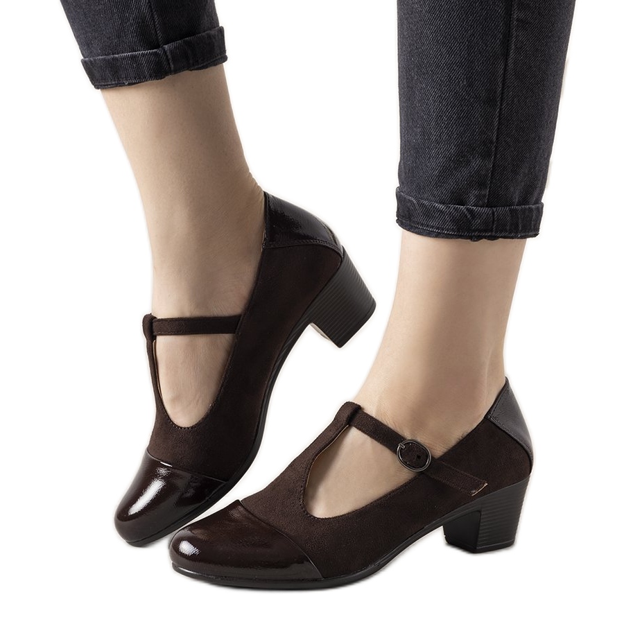 Inna marka Brown pumps on a pillar with a varnished Dessert toe
