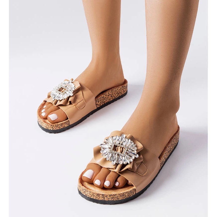 Bet on comfort and a fashionable look with Roy flaps on a cork platform. Classic, brown color and round toe make the model fits perfectly with everyday summer stylizations. The upper made of high quality ecological leather has been decorated with a subtle, zirconium buckle that adds an elegant accent. The high, 3 cm cork sole in combination with the rubber bottom ensures cushioning and stability at every step, and the suede eco leather insert increases wearing comfort.