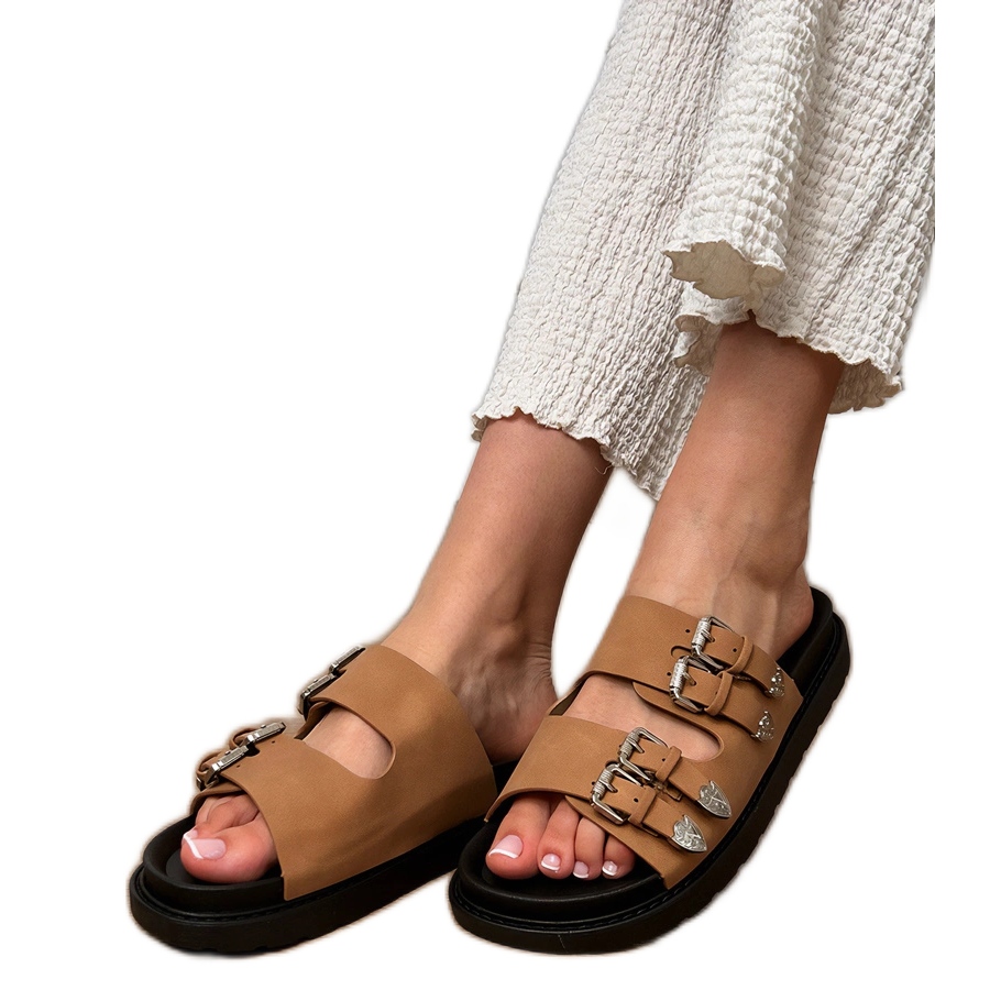 Choose brown flip flops with decorative buckles and enjoy a combination of a fashionable look and comfort every day!