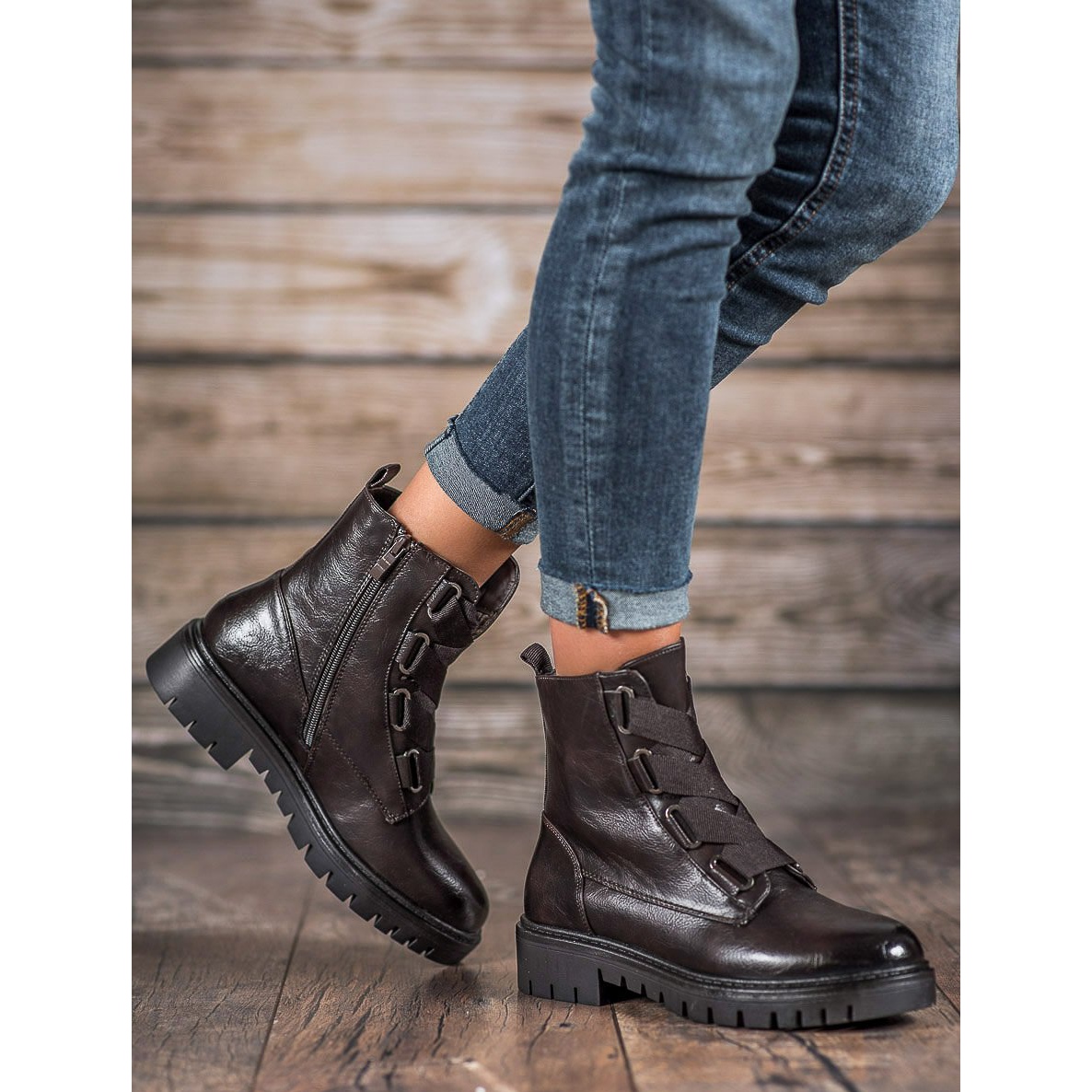 Brown Workers M.Daszyński are the perfect combination of style, comfort and functionality that will surely appeal to every woman. These unique ankle boots stand out with their massive design, which not only attracts attention but also provides exceptional durability, ideal for everyday challenges in difficult conditions.