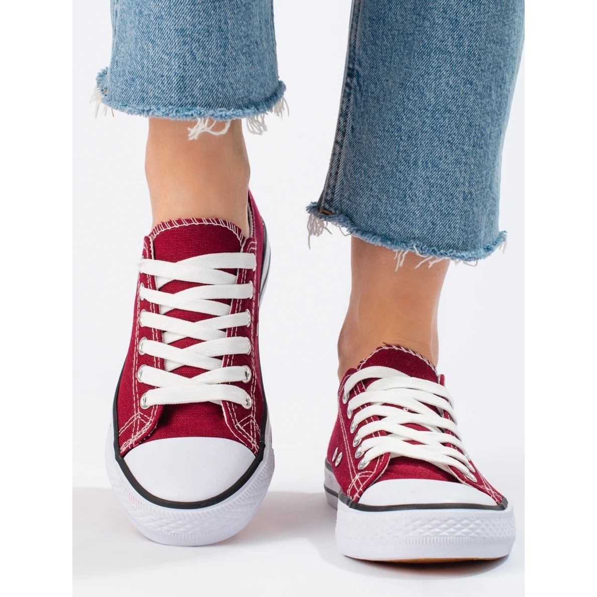Burgundy (burgundy) Shelovet sneakers is a timeless model that will work in both younger and mature women who value sports, fashionable style. Made of breathable fabric, light and comfortable when walking - perfect every day throughout the year. White rubber sole with tread and 2 cm platform add comfort and stability, and lacing allows you to fit to the foot.