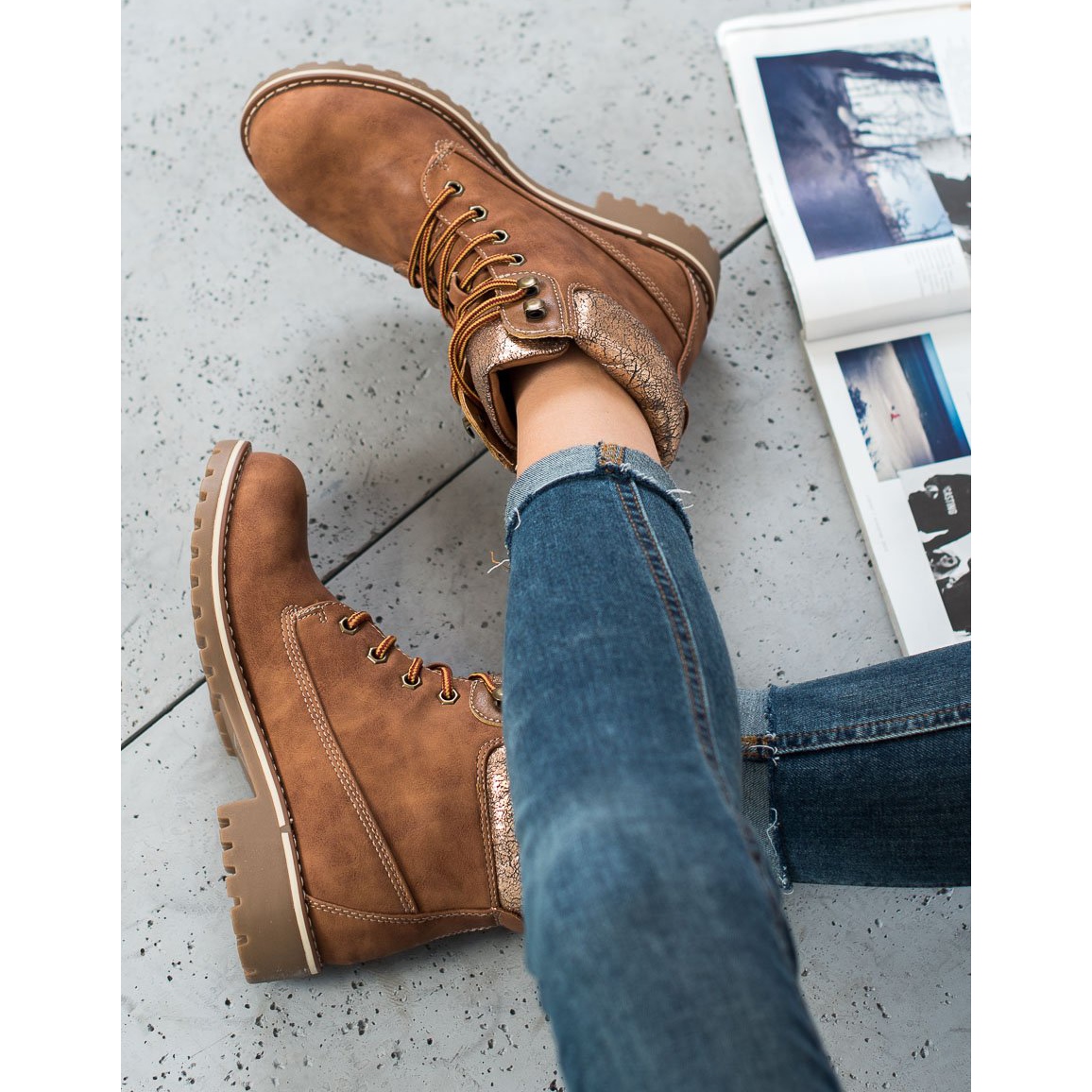 Made of the highest quality ecological leather, the boots are not only aesthetic, but also environmentally friendly. Their lace-up fastening allows for a perfect fit to the shape of the foot, which guarantees comfort of wearing all day long. Additionally, golden decorative elements give them originality and chic, making each styling gain a unique character.