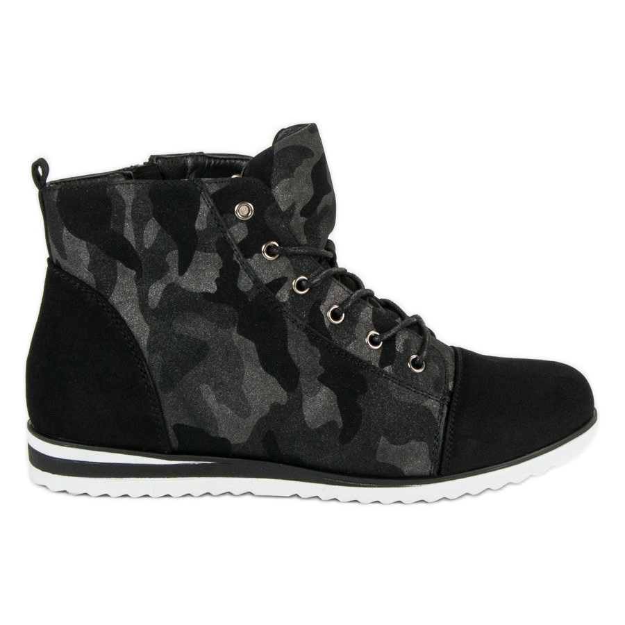 Discover style and comfort with the Vinceza black ankle-high sneakers with a fashionable camouflage pattern. Made of high-quality eco-leather, these sports shoes combine modern design and functionality. The toe and heel in classic black contrast nicely with the central part, decorated with an original camouflage pattern, making them a great choice for women who value unique style.