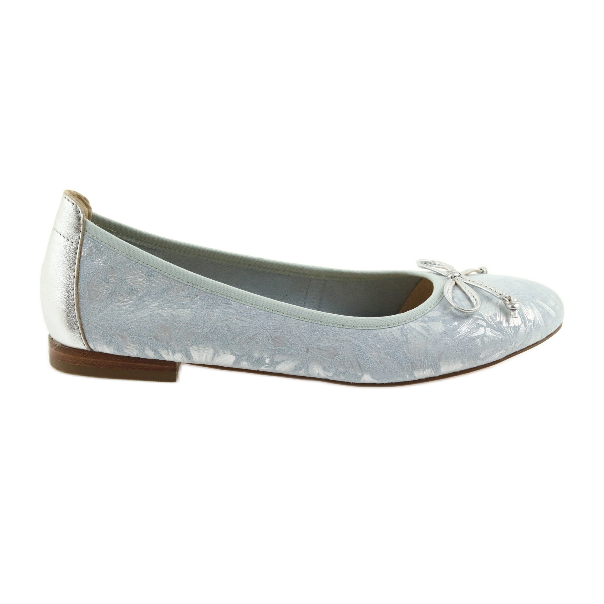 Elegant and comfortable Caprice ballerinas in a delicate blue shade with a subtle floral pattern and a silver bow at the front. Made of natural nubuck, they combine a classic line with everyday comfort - ideal for work, for a walk or meeting in the city.