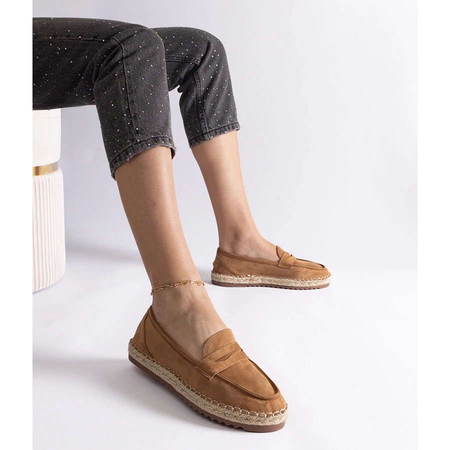 We present caramel sliding espadrilles on the brown platform, which are a perfect combination of fashion and comfort. These unique women's shoes from a reputable brand are must-have for summer days, offering a stylish look and comfort of wearing.