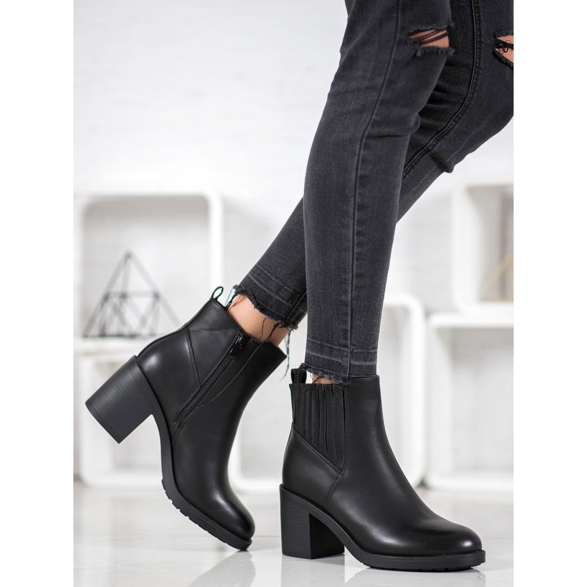 Super Mode Ankle boots are insulated, which makes them great for colder days, perfectly fitting into autumn-winter trends. The classic black color means they will match many styles - both casual and elegant. Thanks to the width of the upper 26 cm and the height of 11 cm, the ankle boots perfectly fit the leg, adding to its slimness.