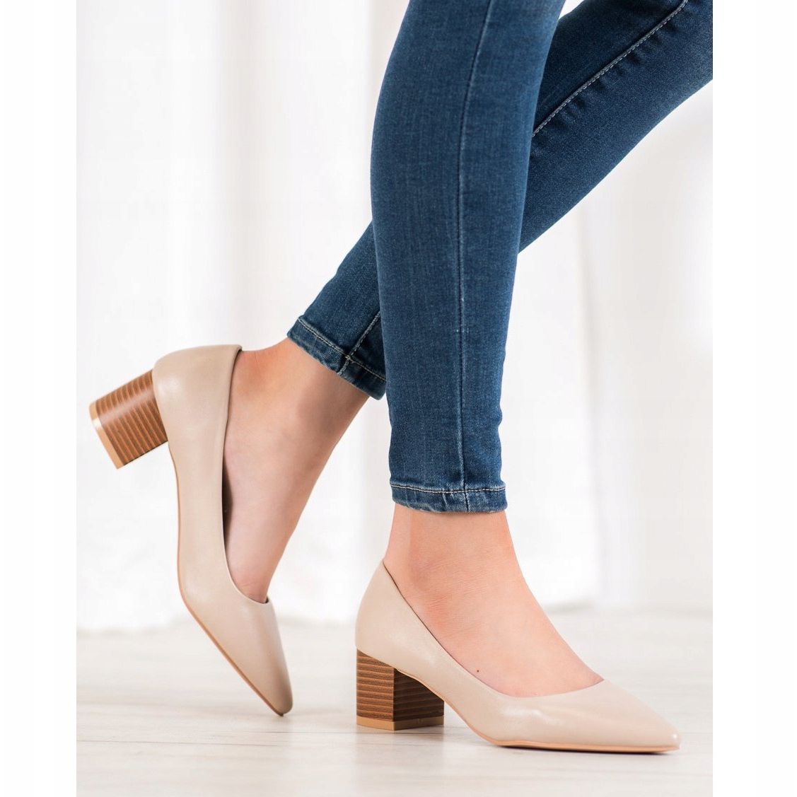 The pumps have a wide 5.5 cm high column heel, which ensures stability when worn. Additionally, a well-shaped inner insole made of ecological leather guarantees high comfort throughout the day. Thanks to the built-in, stiffened heel and the slip-on construction, putting on and taking off the shoes is extremely simple and comfortable.