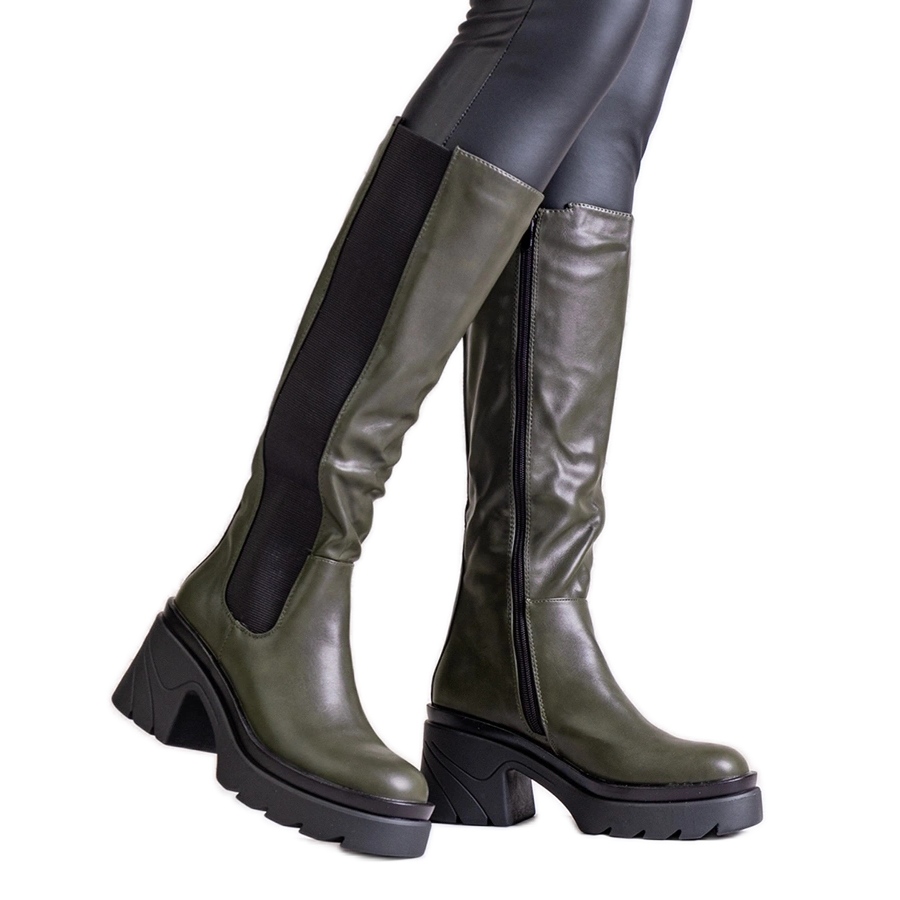 Green boots on the thicker Charla post is a great choice for women who want to combine elegance with comfort. These fashionable shoes, made of high quality eco leather, are characterized by a round nose that gives them style. A height of up to 45 cm and an interesting, practical zip fastener make them perfectly adapt to the figure, and are also easy to put on.