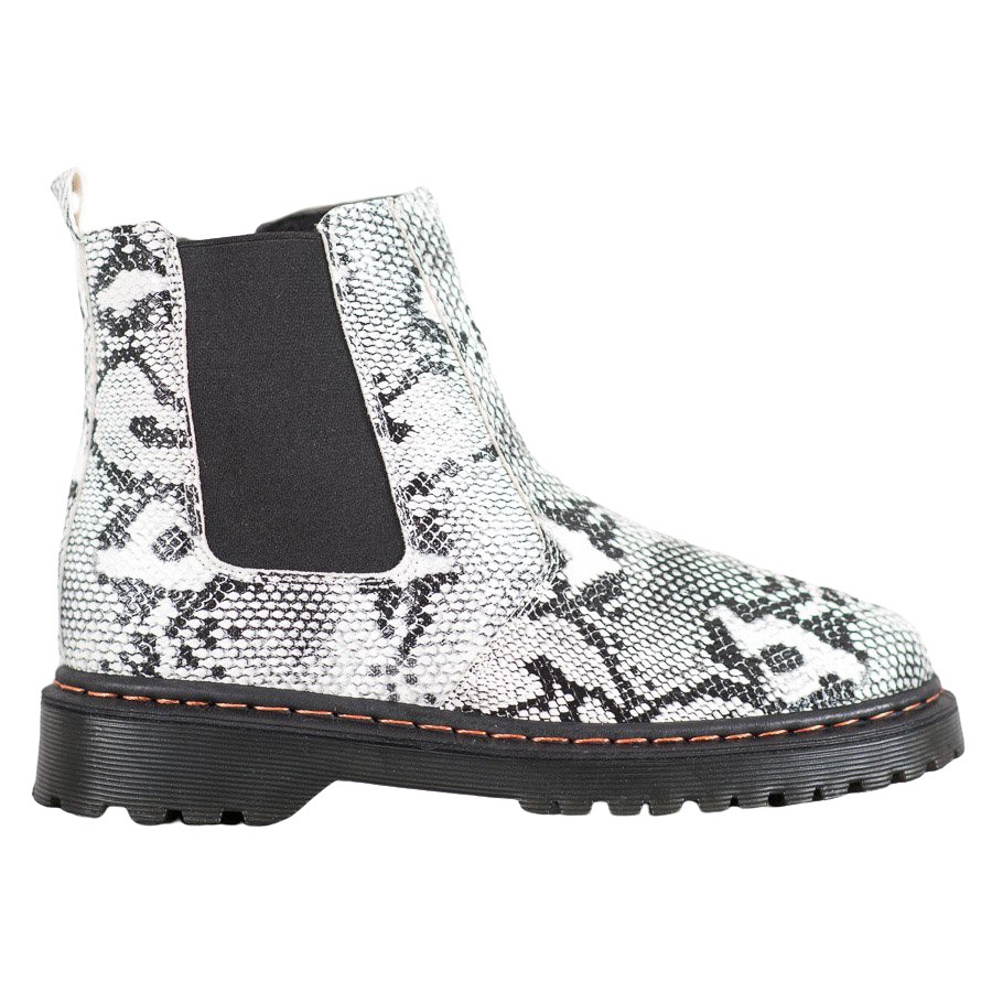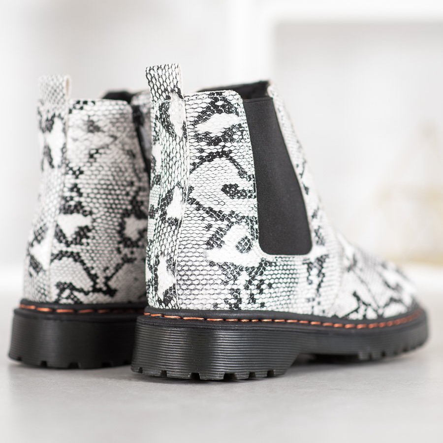 The boots are available in two classic colors: black and white, which makes them easy to match to any wardrobe. The dominant pattern, inspired by animal motifs, gives them a unique character, perfect for lovers of rock and casual style.