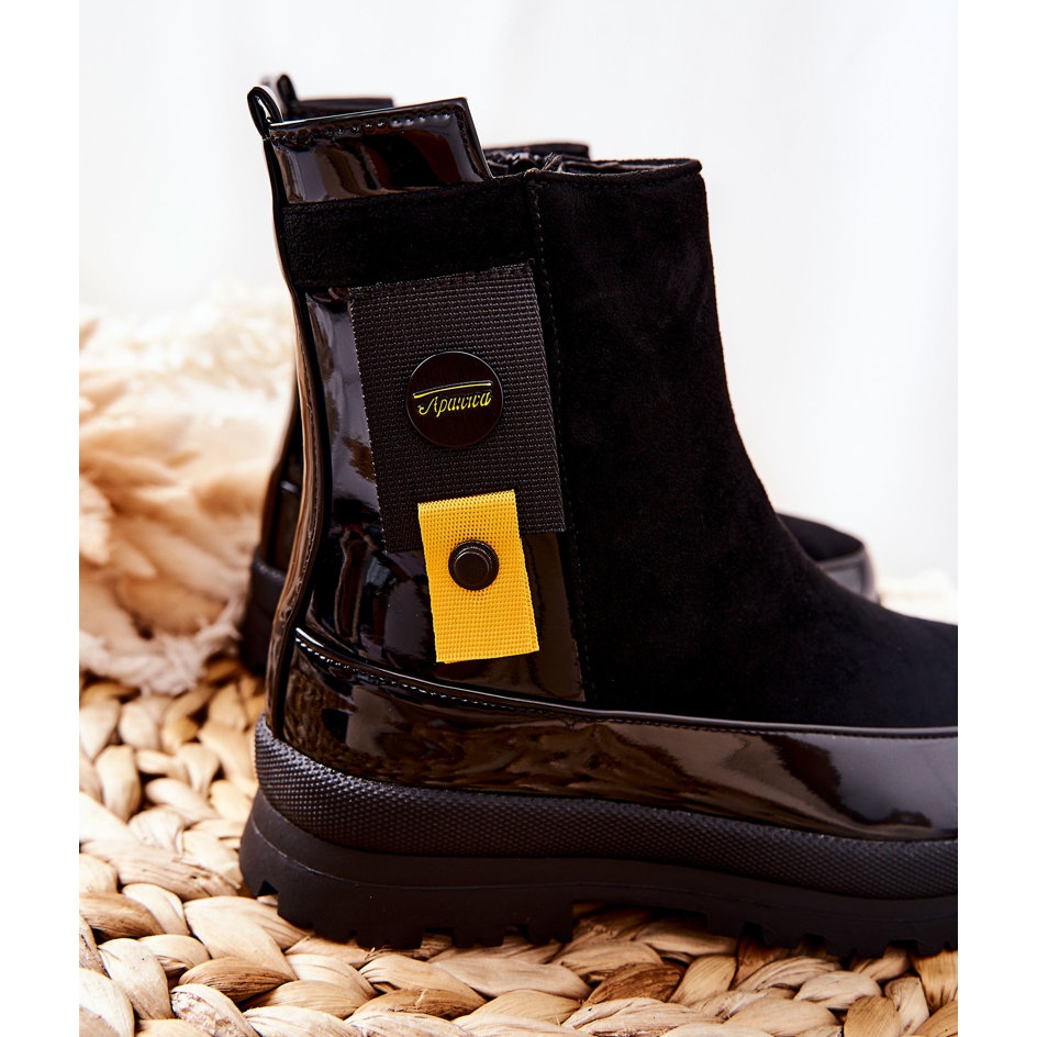 The upper of the shoes is made of high-quality ecological patent leather and imitation suede, which makes them look extremely stylish. Black ankle boots will perfectly fit into various styles, from casual to more elegant, adding a touch of chic to any outfit.