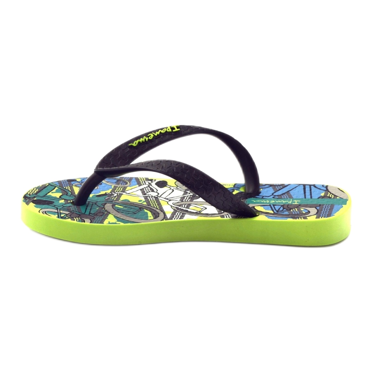 Ipanema 81713 flip-flops are characterized by an elegant black color, which, combined with a bright green sole, creates an original and modern design. The inner part of the shoes is decorated with an interesting cycling motif, which gives them a youthful character. These flip-flops are not only functional, but also stylish, perfect for boys and girls. Thanks to strong, thick straps that firmly hold the foot, children can run and jump freely.