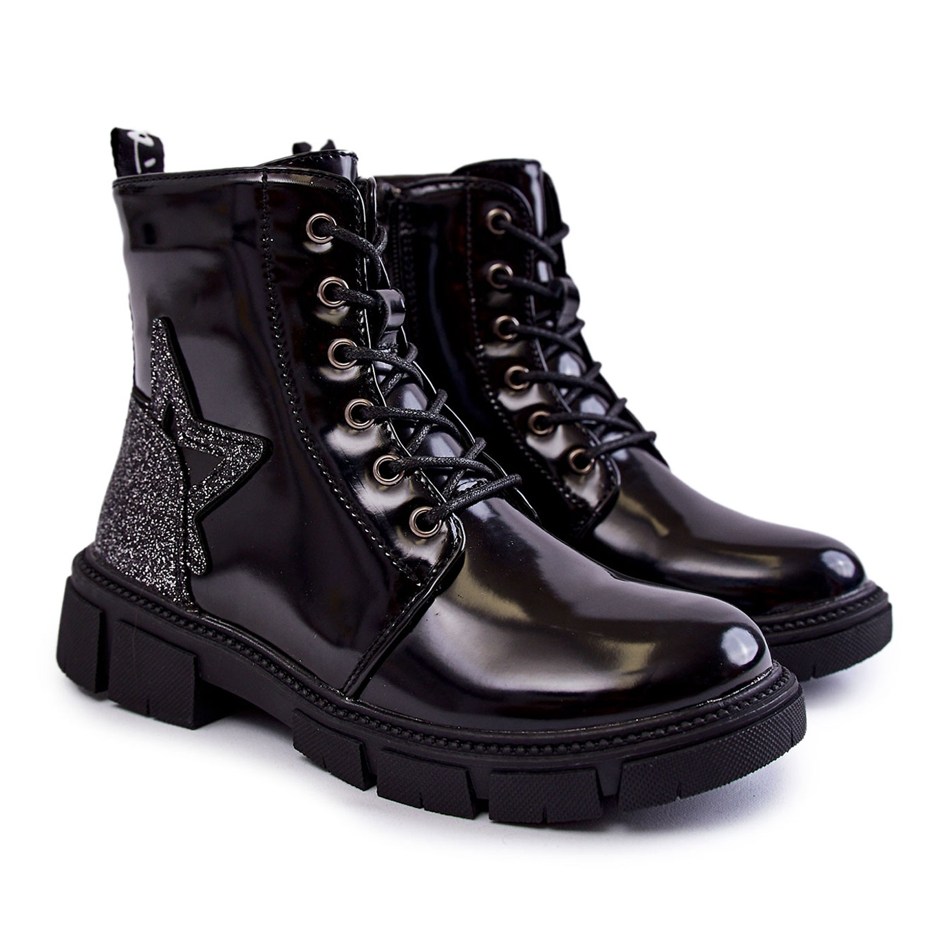 The black ankle boots model is distinguished by classic lacing and a practical zipper on the side of the upper, which makes it easier to put on and take off. Additional glitter decoration on the side adds charm and makes every girl feel special in them.