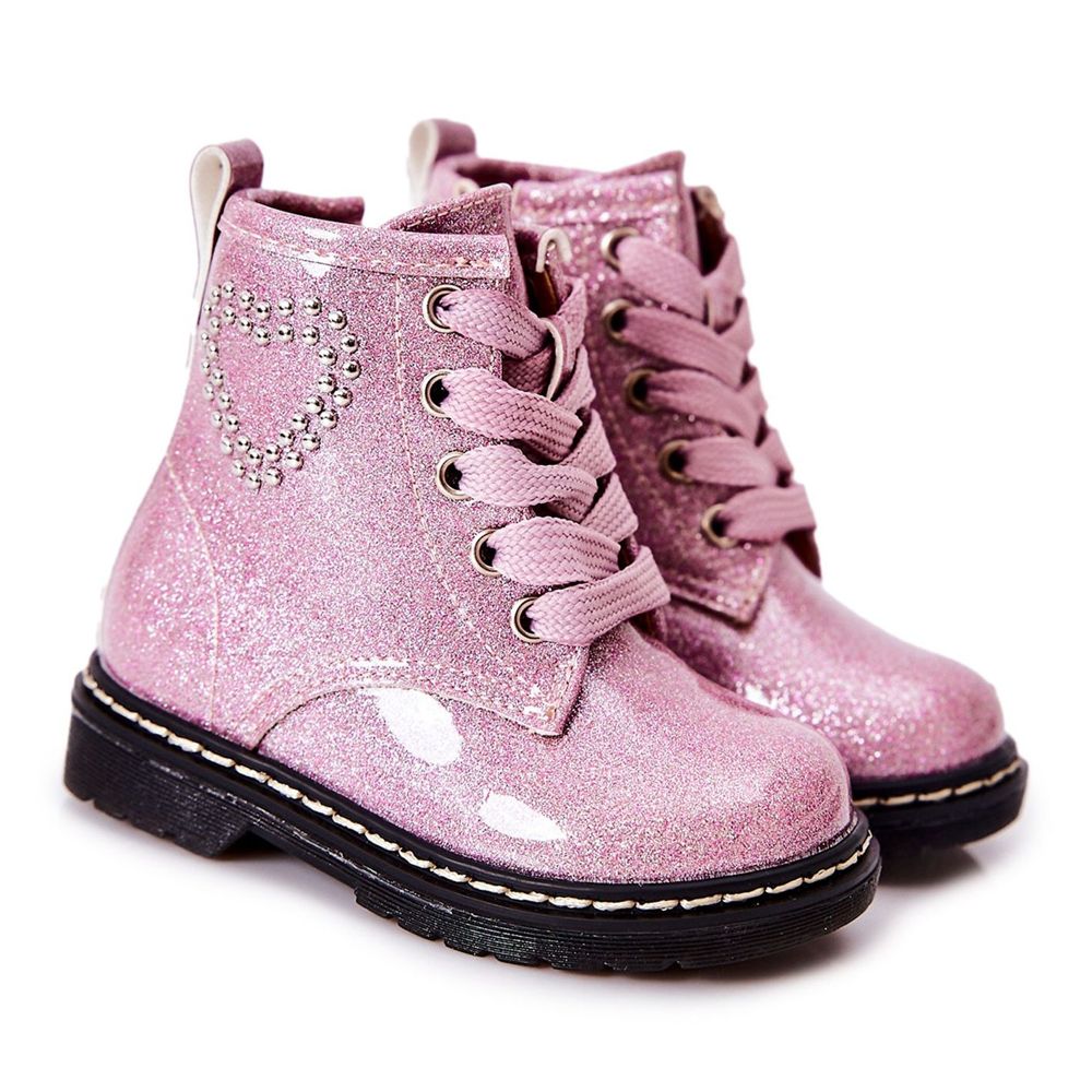 Discover the unique WT1 children's ankle boots in an extraordinary pink color that will delight every little fashionista! These patent ankle boots are characterized by a shiny effect and a charming heart decorated with studs, which adds to their extraordinary style and charm. Thanks to the classic lacing, they will perfectly fit the foot, and the zipper sewn on the side will make putting them on easy and quick.