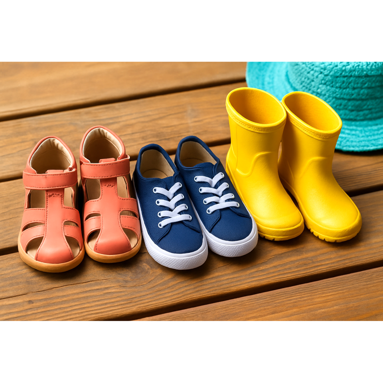 In summer, ventilation and protection against injuries are a priority. Sandals should have a fastened heel - no Japanese for actively running children! The upper should protect your fingers from reflecting. Leather or high -quality synthetic materials provide comfort and hygieno. The sole must be non -slip - test on different surfaces. Choose material sneakers for summer, with good ventilation. Avoid completely tight footwear - the child's feet must 'breathe'. Remember about the caloses for rainy days - children love to jump on puddles!