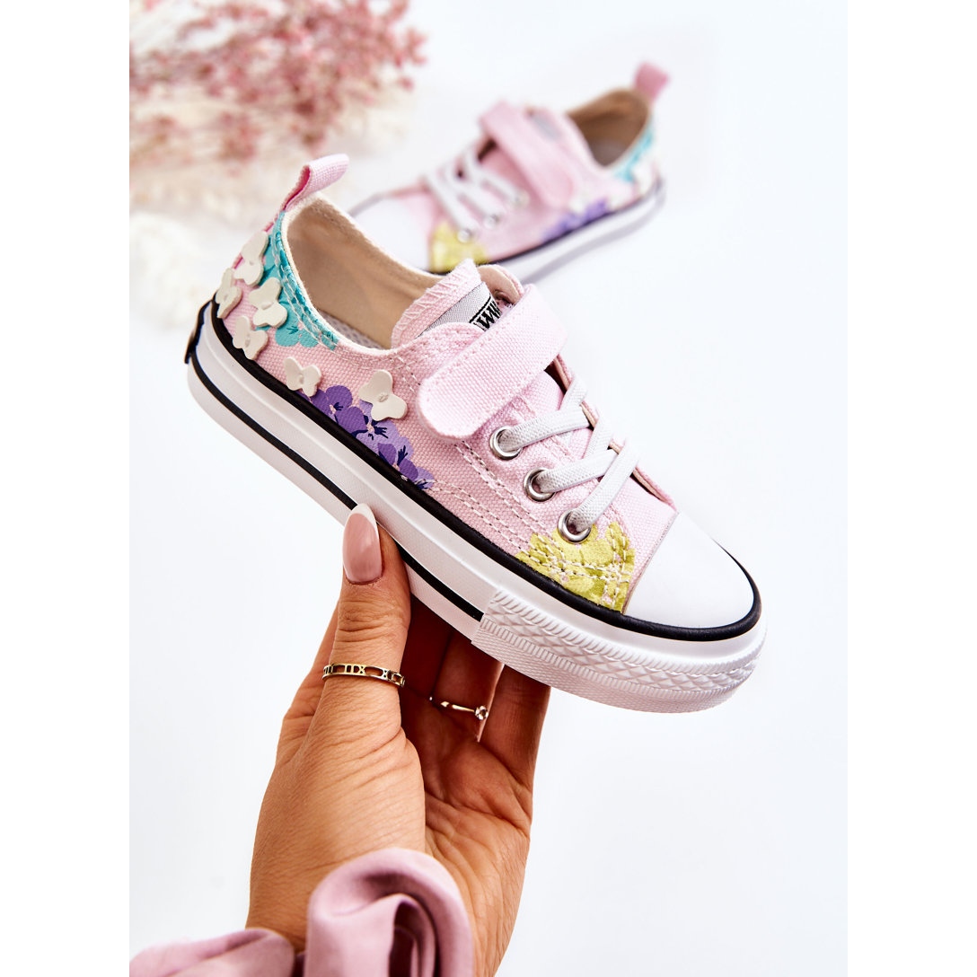 The wonderful pattern and sewn-on butterflies on the side of the upper make these sneakers stand out from the rest. The rubber bands imitating laces add a sporty character, and the soft, removable fabric insole guarantees comfort all day long. The sneakers also have a slightly stiffened heel counter and a non-slip sole made of rubber material, which ensures safety during play.