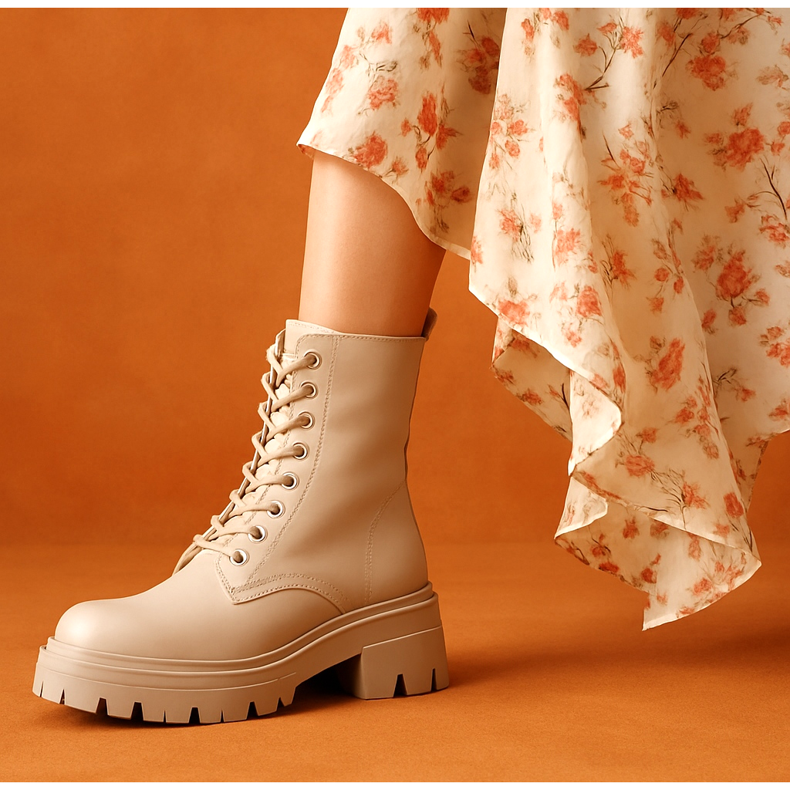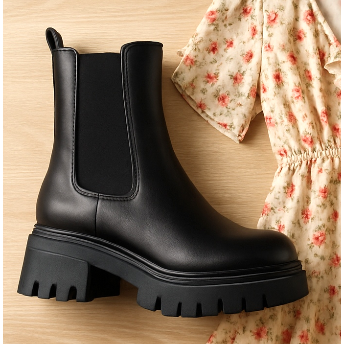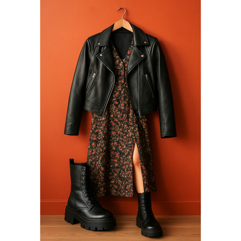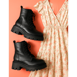The combination of heavy workers' boots with a delicate floral dress is a classic that always works. Choose a midi or maxi dress with a slit that will reveal the upper of the shoe. Add a leather biker jacket or an oversized jacket. This set is the perfect balance between rock style and romantic girlishness. Remember not to overdo it with accessories - shoes are a strong enough accent here.