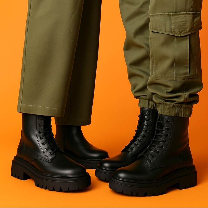 If you prefer trousers, chunky boots look best with straight or wide leg models that fall slightly over the shoe but do not cover it completely. You can also tuck your pant legs in (military style) if you have cargo pants or joggers. Avoid combining them with very tight tubes, unless you want to achieve the "stick in your shoe" effect.