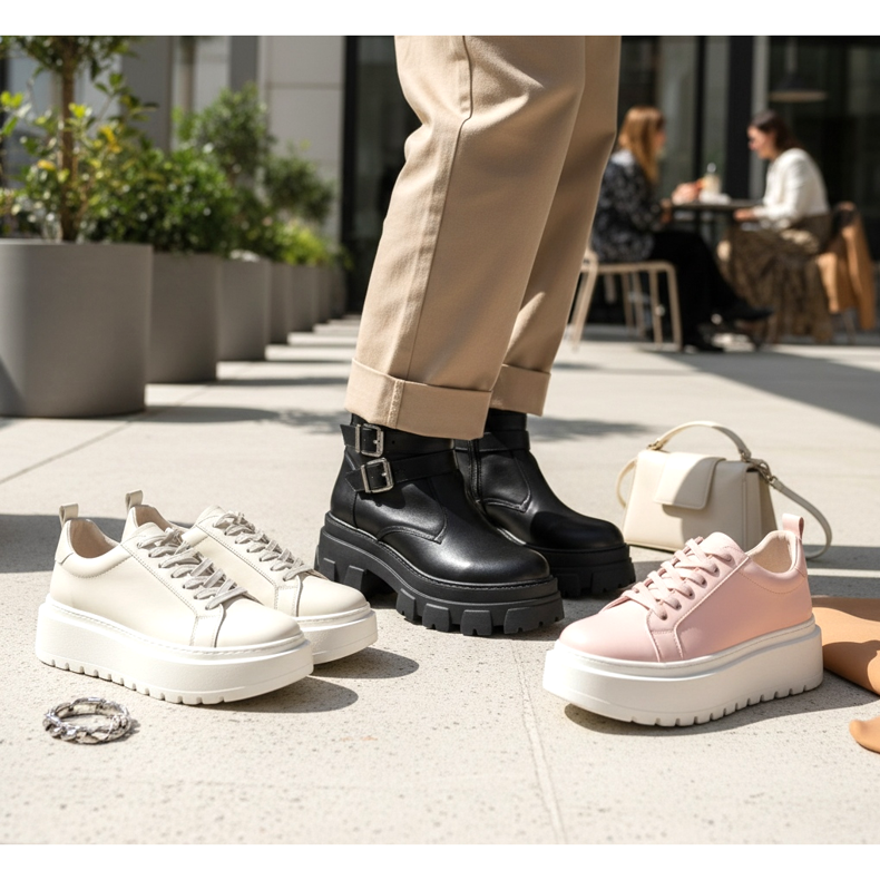 Everyday platforms are an excellent choice for people who value comfort and want to add a few centimeters to their height without having to balance on high heels. Sneakers with a massive sole go perfectly with straight-cut jeans, an oversize T-shirt and a bomber jacket.