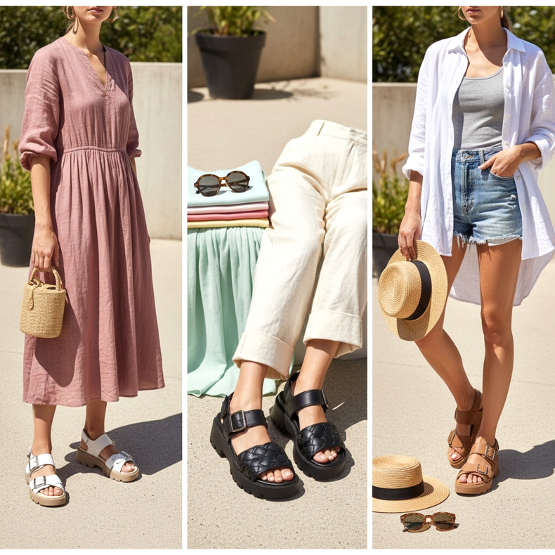 Massive sandals with wide-legged trousers are the hit of summer 2026. Mirrored dresses or airy linen trousers perfectly match the thick sole, creating a balanced, fashionable look. Remember that the leg length should reach the ankle or be slightly rolled up so that the shoes are visible.