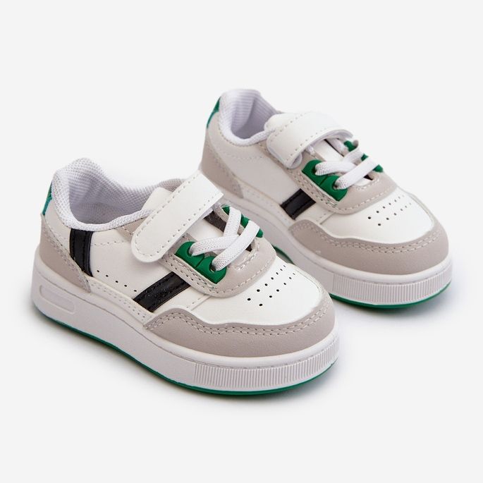 We present classic white-green children's sports shoes, which will delight every little fan of comfort and style. Made of high quality eco leather, these sneakers combine elegance with functionality, thanks to the delicate perforation on the front, which not only adds character, but also provides ventilation.