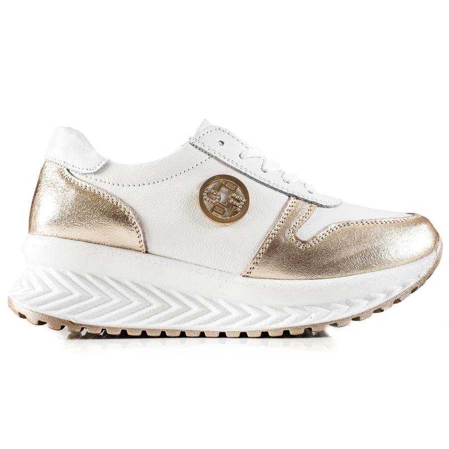We present classic leather sneakers from the Filippo brand, which are a perfect combination of comfort and style. These elegant women's shoes in white with spectacular gold accents are a great choice for everyday wear. Thanks to the soft, closed heel and round toe, wearing them is pure pleasure.