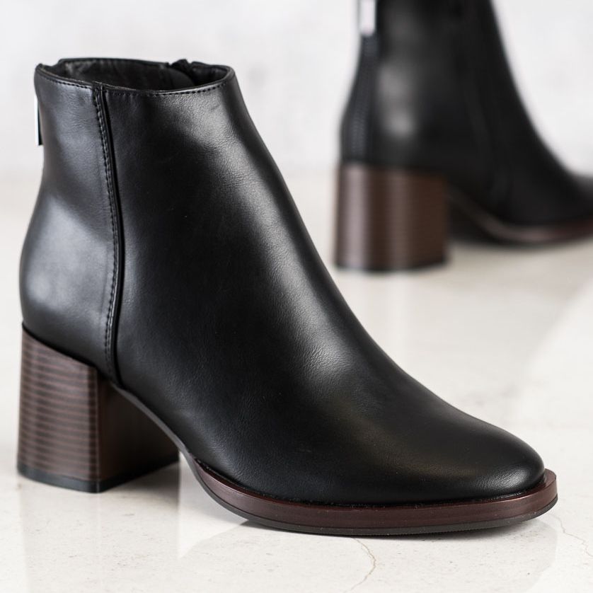 The ankle boots are ankle-high and are set on a 6.5 cm high block heel, which ensures comfort when worn, even for a longer period of time. The round toe and the closed, stiffened heel add character to them, and the decorative zipper not only makes them easier to put on, but also constitutes an interesting decorative element.
