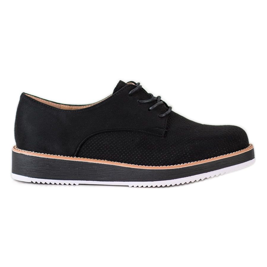 The shoes have a solid 3-centimeter platform with a treaded sole, which provides good grip and stability on various surfaces. The openwork front part of the shoes, decorated with delicate holes, gives them a unique character and originality. The lace fastening allows for a precise fit to the foot, ensuring comfort of wearing all day long.