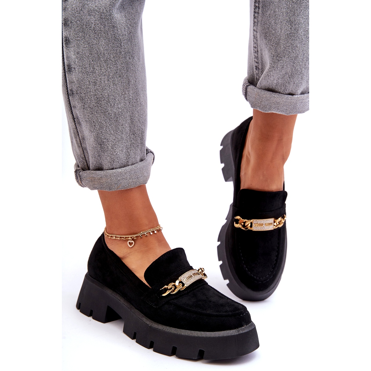 Stylish and comfortable Seastar moccasins combine a classic cut with a modern accent - a massive platform. Made of ecological leather in a suede invoice, set on a 5 cm platform, they will perfectly complement both casual and more elegant sets. The detail in the form of a chain with a decorative baking tray and rhinestones adds character and emphasizes the fashion nature of the shoes. You should have this model!
