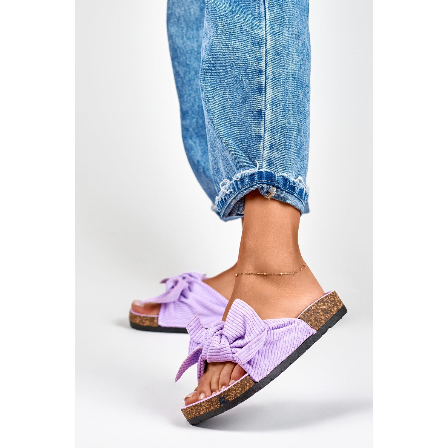 Made of eco-friendly suede, the flip-flops not only look beautiful, but are also environmentally friendly. Their intense purple color attracts attention, and the subtle bow adds feminine charm. The slip-on model makes putting them on a real pleasure.