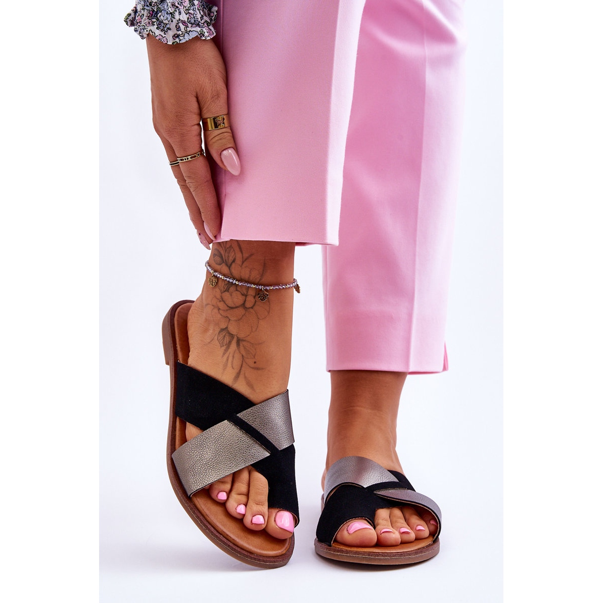 This model is distinguished by crossed straps that gently envelop the feet, giving them a subtle look. The soft eco-leather insole ensures comfort while the open, slightly rounded toe adds lightness to the entire style. The flip-flops are set on a flat heel of 1.5 cm, making them ideal for everyday wear.