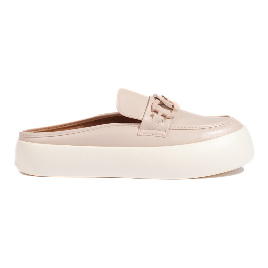 Made of high quality ecological leather, both the outer and inner layer ensure durability and ease of maintaining. What's more, a comfortable ecological leather insert makes every step comfortable and pleasant. An additional advantage is the details in the form of a chain, which give the flaps a fashionable character.