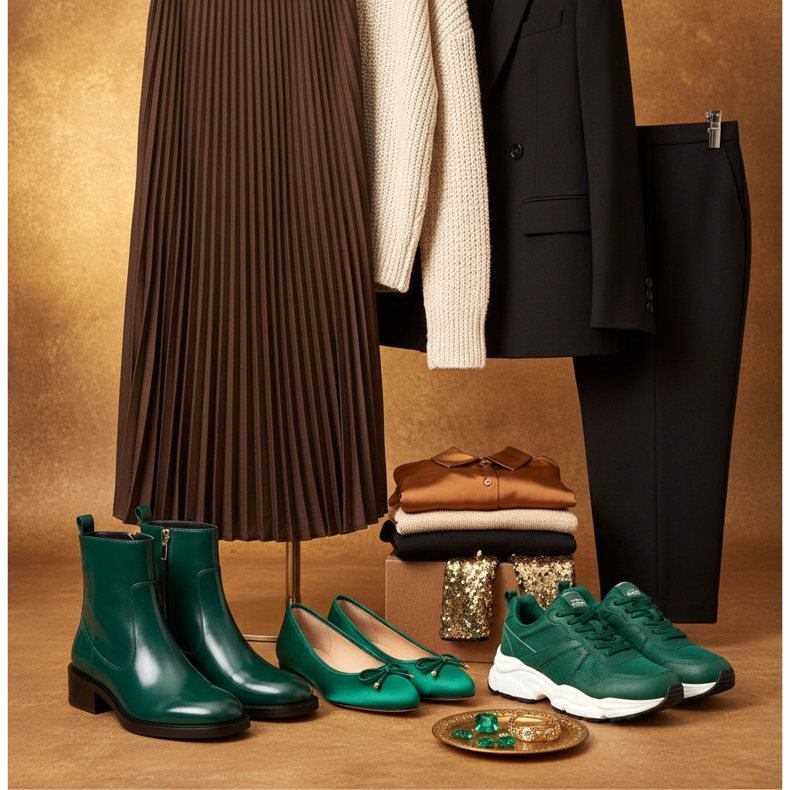 Emerald ankle boots or loafers go perfectly with brown, caramel and gold - a combination that evokes the Middle East and an exclusive atmosphere. Try emerald ballet flats with a long chocolate brown skirt and a cream sweater - it's a style that will delight everyone.