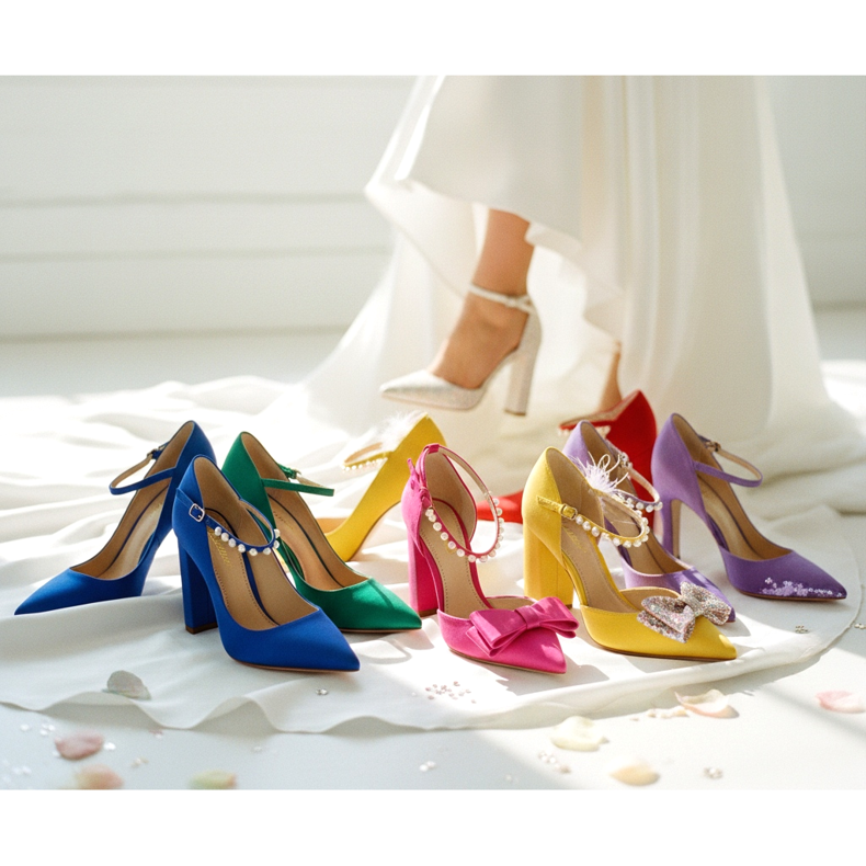 The great advantage of colorful wedding shoes is their practicality. White satin high heels often end up in a box right after the wedding and are never used again. You can successfully wear elegant, colorful high heels or sandals for an anniversary dinner, a friend's wedding or a summer dress. This is a purchase for years, not for one night.