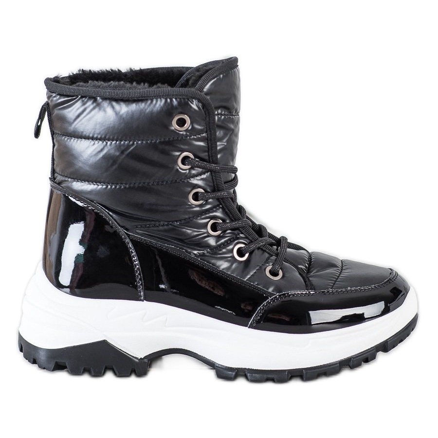 Made of high-quality materials, these shoes are durable and aesthetically pleasing. The upper part of the snow boots made of soft, eco-leather and imitation leather (50% textile and 50% leather) provides adequate protection against cold and moisture, while the patent finish gives them an exceptional shine.
