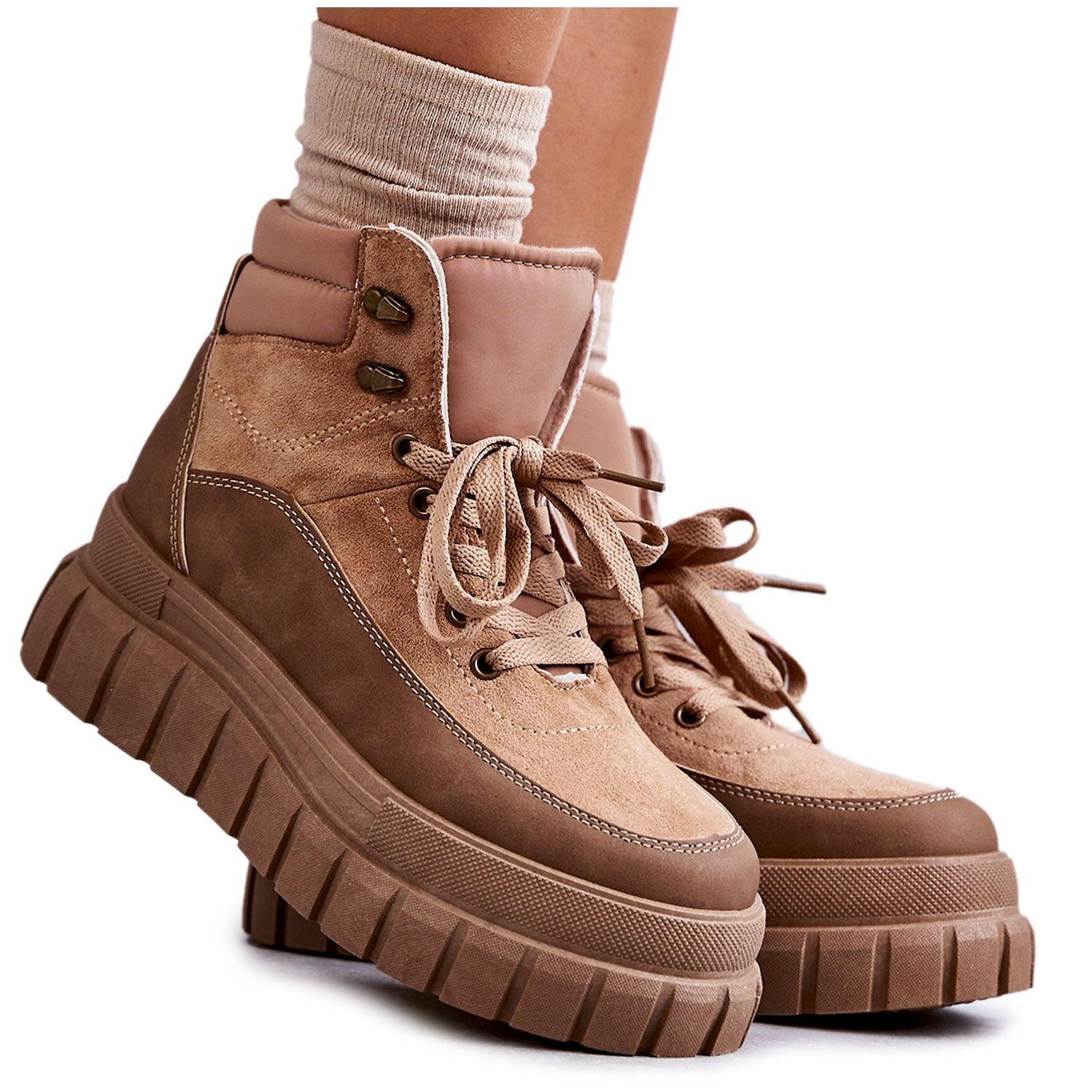 Elegant women's boots embedded on a massive, non -slip sole is a combination of fashionable appearance and everyday comfort. The upper made of a combination of soft eco suede and eco leather looks stylish and is pleasant to the touch. Classic, flat shoelaces allow you to match the width of the upper, and the rounded nose gives them a universal character.