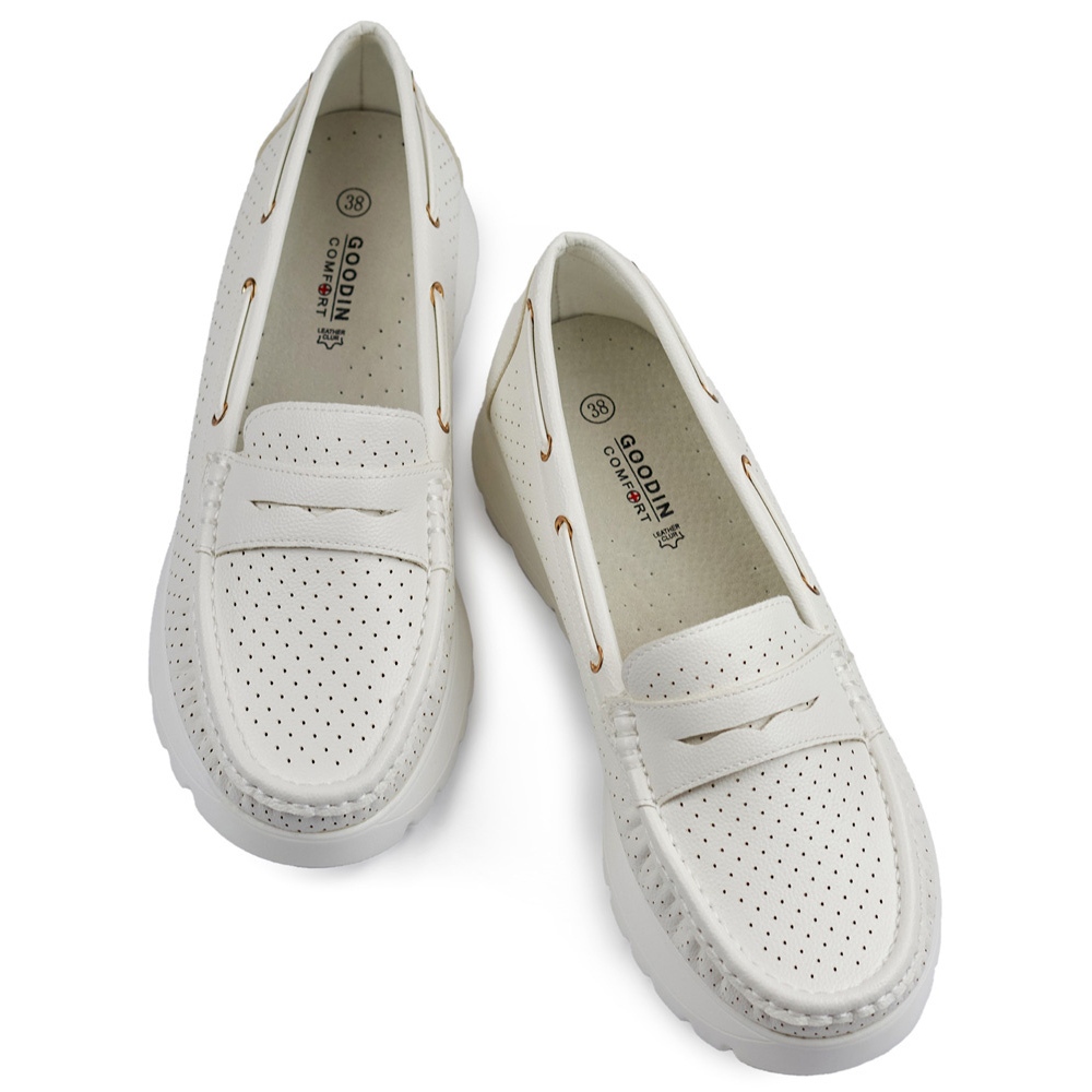 Details: Comfortable openwork white women's moccasins with a leather insole