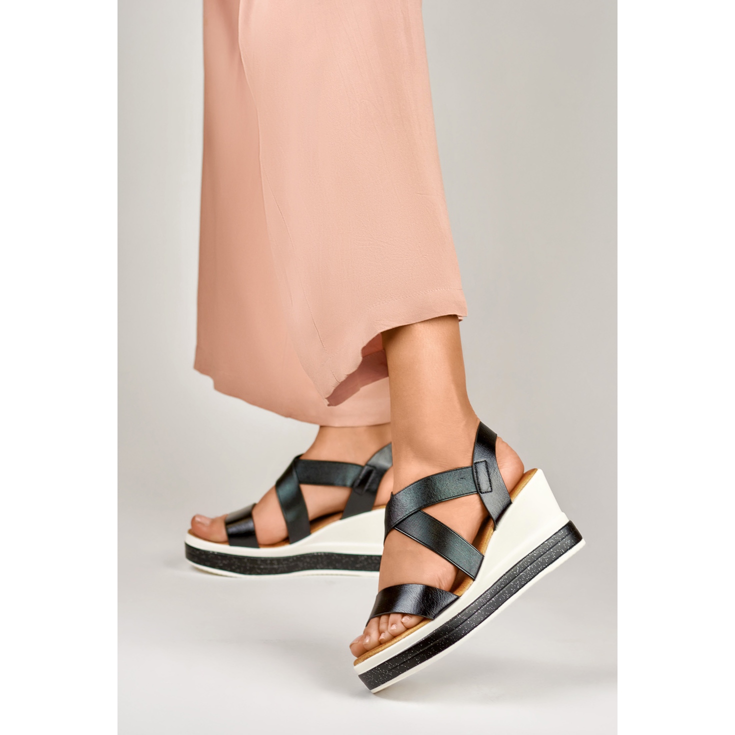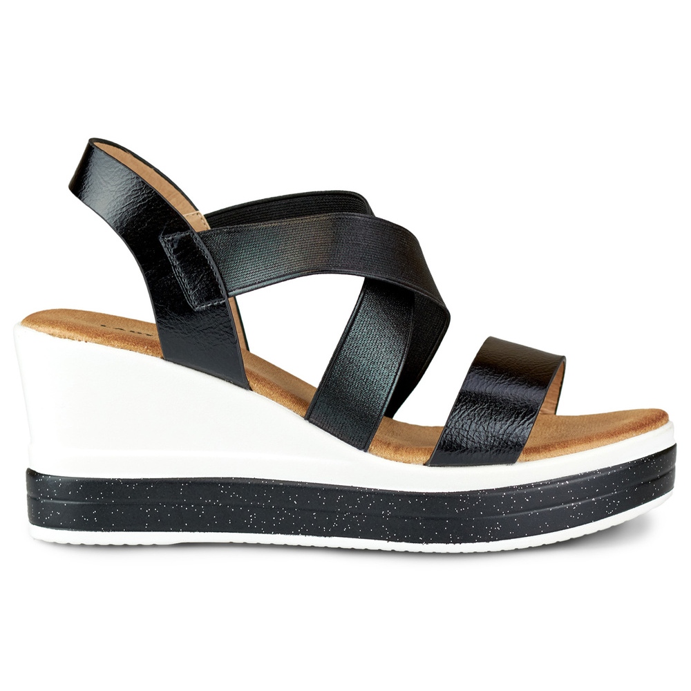 Comfortable wedge sandals with black stripes - classic in a summer installment. Elegant and comfortable women's sandals made of ecological leather. Black color and simple, timeless cut make the model perfectly match both everyday and more elegant stylizations.
