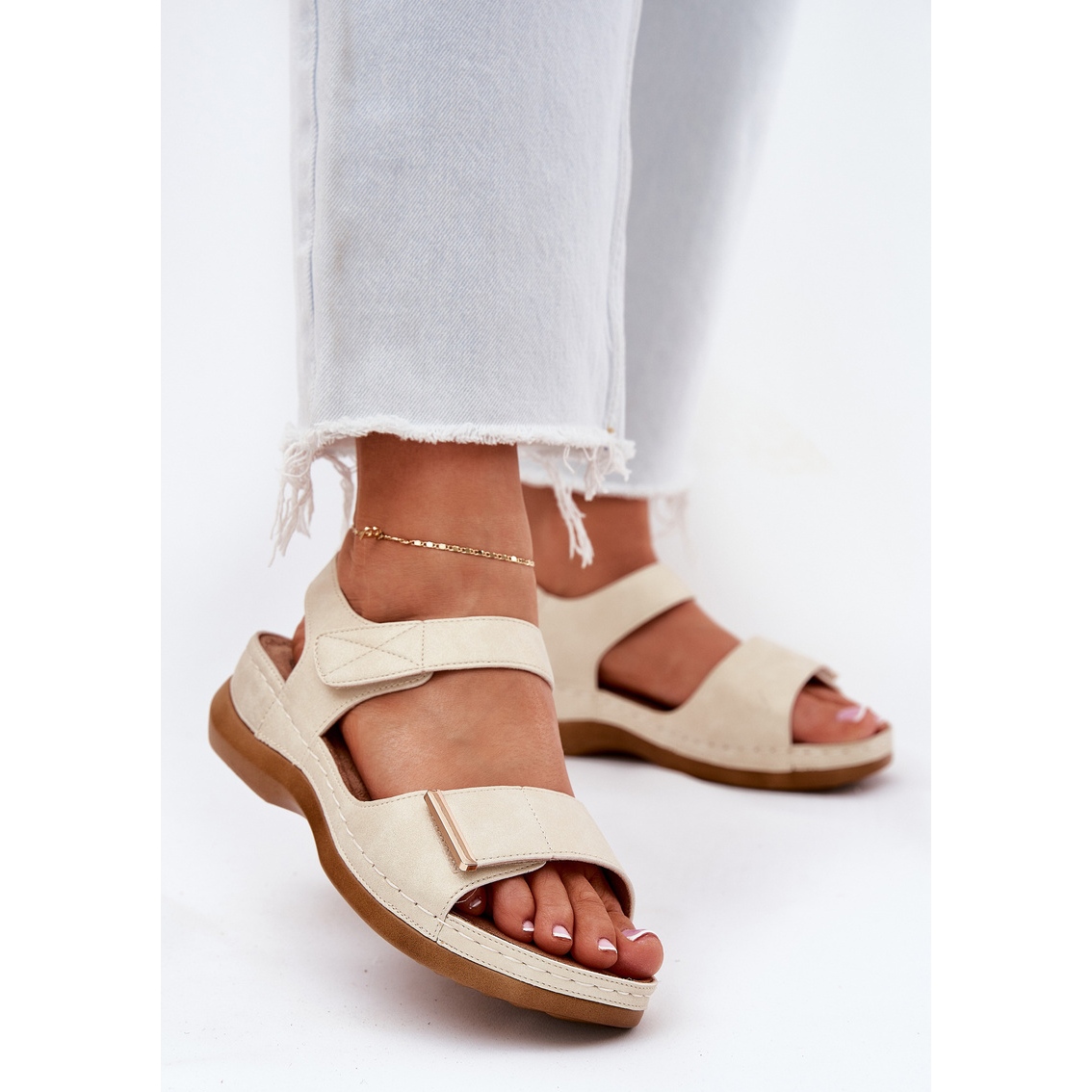 Here are comfortable women's Velcro sandals from the Evento manufacturer, which perfectly combine style and comfort. Beige-gold, made of high quality eco leather, these sandals are the perfect choice for summer days. Their simple, classic cut makes them perfectly match various stylizations, giving them an elegant accent.